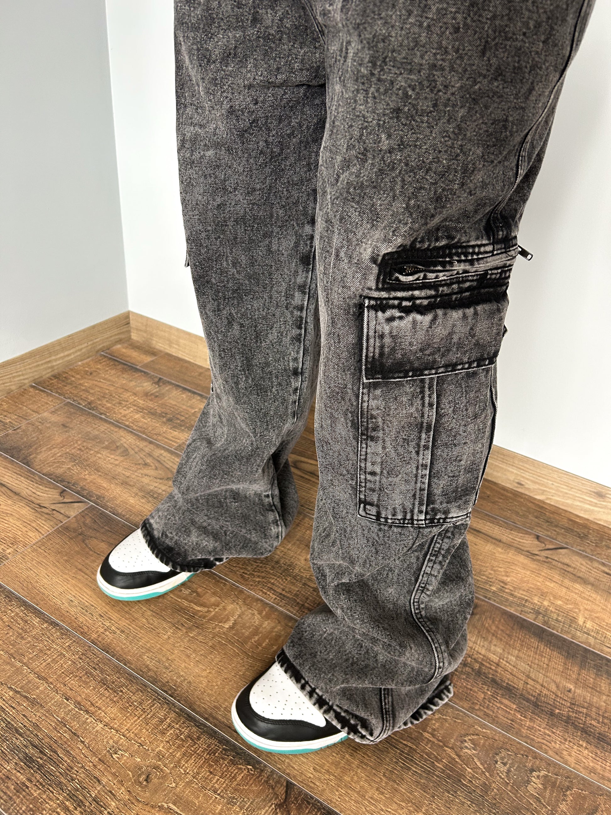 Su tono gris oscuro desgastado aporta profundidad y carácter sin necesidad de contrastes extremos. Es un baggy cargo que transmite solidez visual, ideal para outfits urbanos más sobrios pero con presencia.