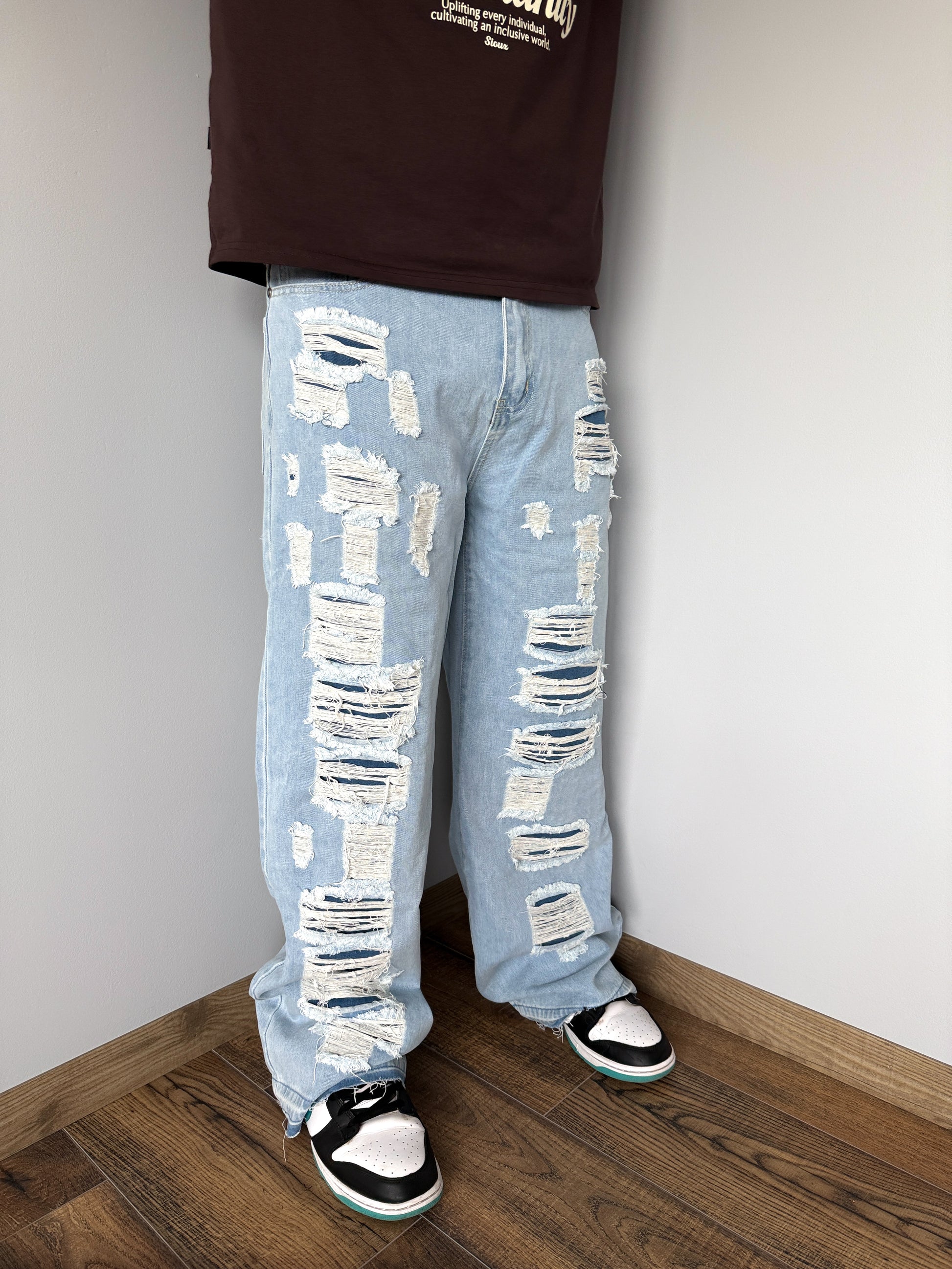 Su lavado claro con desgaste marcado crea un impacto visual inmediato. No es un baggy discreto: es una pieza que habla por sí sola. El efecto distressed aporta textura y profundidad al diseño, generando un look fuerte sin perder equilibrio.